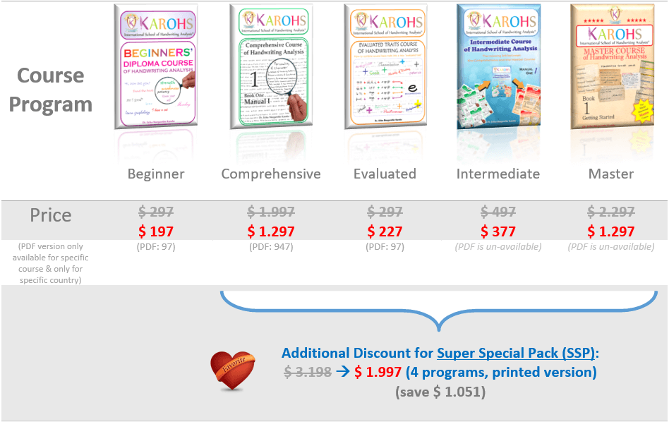 PRICE LIST NOTE: All material in Beginner will be taught also in Comprehensive course (mean: if you enroll Comprehensive course, you will learn also all material in Beginner’s course) Order ♥ Free Shipping ♥ Order Quick Link Registration Process Testimony FAQ Order See detail courses programs (click the image below): Copyright © 2019 the KAROHS International School of Handwriting Analysis®. All rights reserved. No image or portion of this website may be copied or reproduced without written permission.